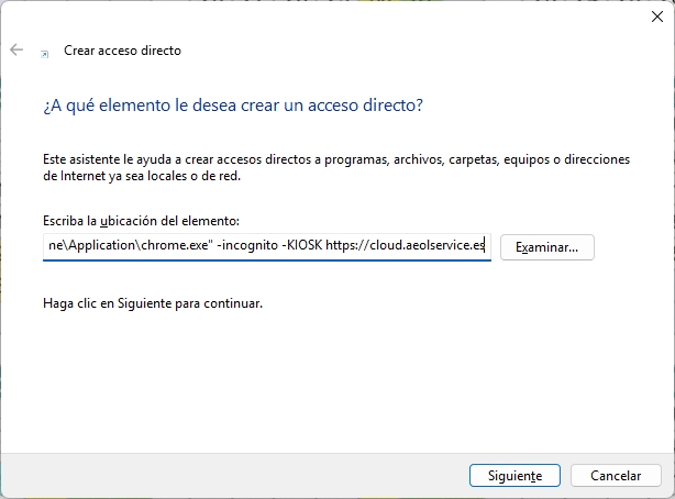 «C:\Program Files\Google\Chrome\Application\chrome.exe» -incognito -KIOSK https://cloud.aeolservice.es